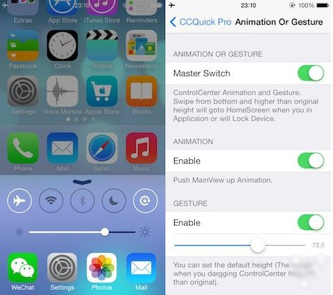 《CCQuick Pro for iOS8》是一款通知中心增强的插件,它可以在通知中心里自定义快捷开关,各种开关的图标被重新设计过,并且加入了许多新功能。插件支持手势打开通知中心,可自定义隐藏通知中心的部分内容,还可以修改通知中心的颜色。