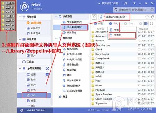 3. 通过 Zepplin 也可将用户自己制作的图标替换运营商文字,前提是要先 DIY 出 PNG 格式图案( 150*40 像素)并放入相关文件夹。以制作好的海贼王图标来示范,打打开 P助手 该文件夹导入文件系统(越狱) --/Library/Zeppelin 中即可。