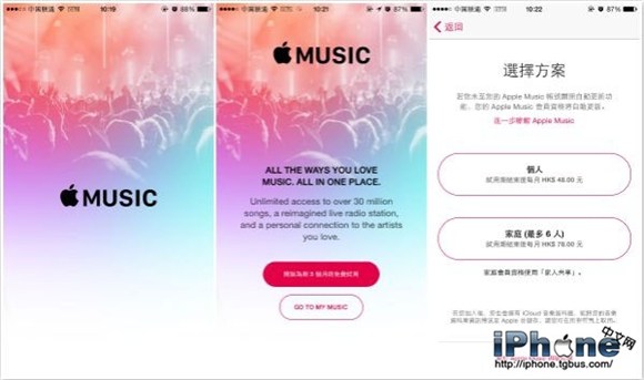 iOS8.4正式版中最大的改变莫过于Apple Music。由于尚处在推广阶段,因此用户可以免费使用Apple Music三个月,三个月试用期结束后,美国区ID用户需每月缴纳9.99美元,而香港区则每月缴纳48港币,约合人民币38元。除了个人用户套餐外,苹果还推出了家庭共享套餐,最多6人每月78港币,约62元人民币。