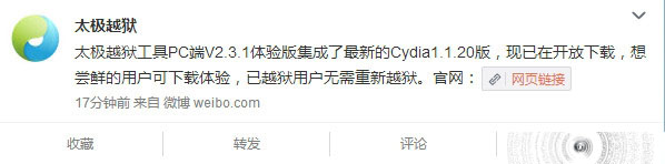 在太极越狱工具2.3版发布短短几天之后,太极团队就推出了2.3.1版。