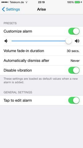 《Arise 2 (iOS 8+)》是一款闹钟铃声自定义插件,插件提供三个实用功能,分别是:针对不同闹钟设定不同的音量大小;闹钟铃声自动关闭时间,15秒-3分钟可选;和铃声从低到高渐入时间设置,同样提供15秒-3分钟可选。