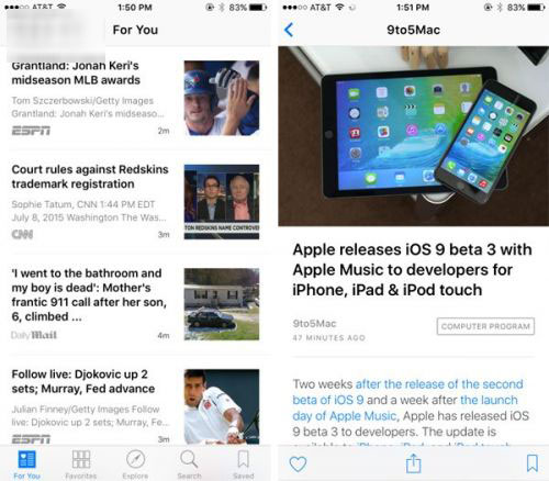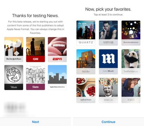 首个版本默认提供了纽约时报、CNN、ESPN、大西洋月刊以及Slate杂志五个订阅源供用户选择(后期订阅源内容会逐步增加),苹果会要求你从中至少选出三项感兴趣的内容。除此之外,你也可以手动添加RSS订阅,直接在Safari中访问你想添加的网站,然后点击“分享”按钮,选择“添加到新闻”即可。