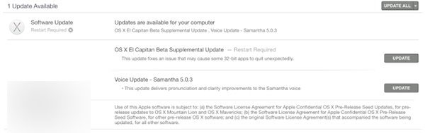 7月12日,苹果向OS X EI Capitan公测版用户推送了一个“补充升级”,解决了一个可能导致32位程序崩溃的问题。该补丁向公测用户和开发者用户同时开放。