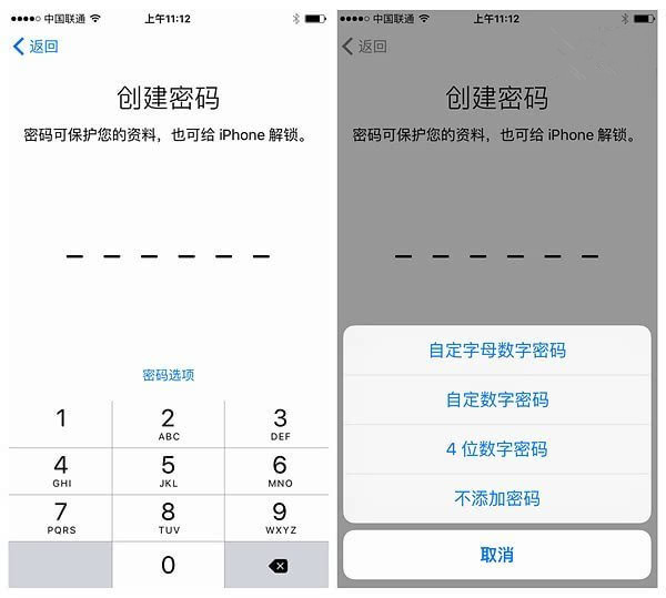 ▼安装完成后的初始设置界面,iOS9公测版Beta1就展示了它的与众不同,比如这个密码创建页面, 默认的密码位数从4位变成了6位,组合的增多使密码的复杂程度有所提高,不喜欢这么长或者不需要密码的朋友,也可以通过点击键盘上方的“密码”选项,切换到自定字母数字密码、4位数字密码或不添加密码。