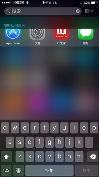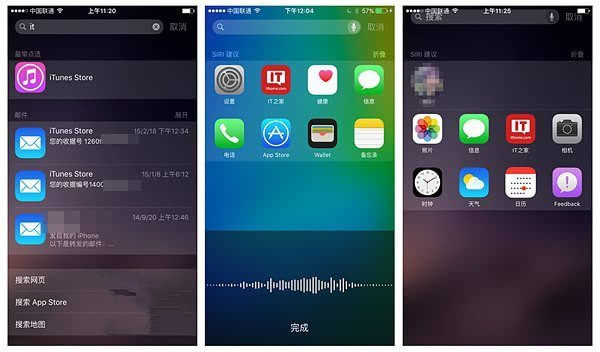 ▲全新的Spolight文字搜索,语音搜索以及Siri建议功能,最右图界面上还存在重叠的问题。