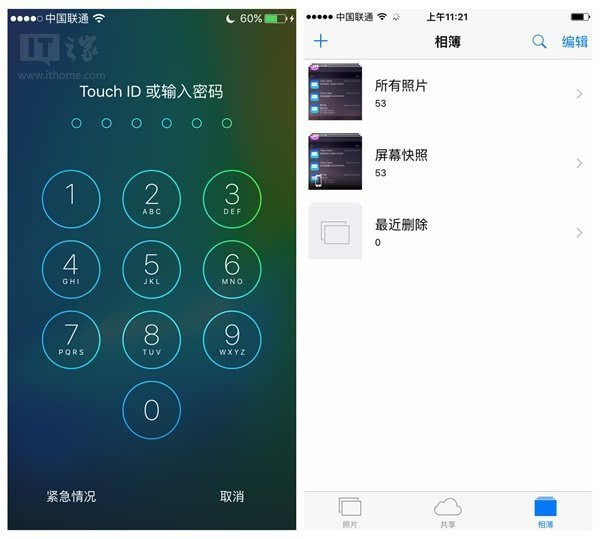 ▲在 设置Touch ID时,默认密码也提升到6位;右侧的相簿中多了自拍、屏幕快照等的单独分类。