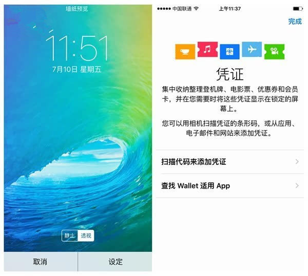 ▲壁纸设置界面底部的按钮更加清晰,描述也变成了“静止”和“透视”;原有的Passbook功能被升级成“Wallet”苹果钱包App。