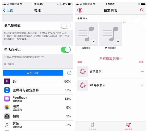 ▲全新的低电量模式,能够看到每个应用的具体前台、后台耗电情况, 开启低电量模式后电池也会变成黄色,具体的省电效果我们将在后续进行测试;右侧则是全新的Apple Music界面,在国内的功能比较简单,除了图标外,和之前的音乐也没多大区别。