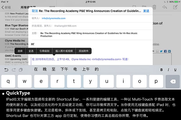 iPad在文字编辑方面拥有全新的Shortcut Bar,一系列便捷编辑工具,一种以Multi-Touch手势选取文本的便利新方式,以及经过优化的中文自动更新功能,你可以尽情挥洒文字。