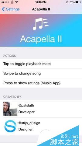 《Acapella II (iOS8.4+)》是《Acapella》的后续作品,是一款基于手势操作的音乐播放器,比如点击标题可播放或者停止音乐,滑下可选择重复播放或者随机播放等,可通过设置来选择自己喜欢的手势。插件可覆盖系统中所有音乐控制界面,锁屏、控制中心以及音乐App。