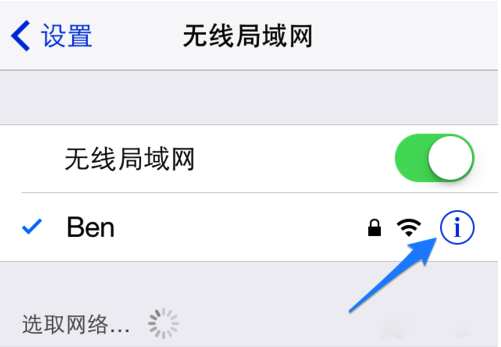 2、点击当前 iPhone 连接的无线网络右侧的“叹号”图标,如图所示