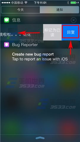下拉出通知中心后,在通知一栏中【向左】滑动信息栏,点击弹出的【回复】按钮即可。(如下图)