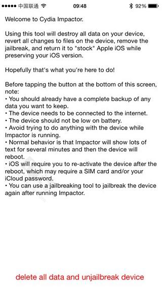 4、运行Cydia Impactor,然后点击底部红色的“delete all data and unjailbreak device”字样,删除所有数据并取消越狱。一旦操作开始之后,就不要再触碰你的设备,直到iOS设备上重新出现欢迎界面,按照提示进行重新设置并进行备份恢复即可。