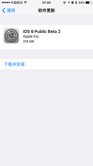 这次更新大约是300MB左右(根据设备不同大小略有变化),目前已经是iOS 9公测版的用户可以直接点击“通用-软件更新”实现升级。若目前还是iOS 8.x版本,则需要到苹果官网iOS公测版页面注册更新,具体方式请看我们之前写过的升级攻略。