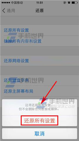 2)点击【还原】进入,点击第一个【还原所有设置】。(注:【抹掉所有内容和设置】会删除所有的数据,小伙伴,别点错了。)(如下图)