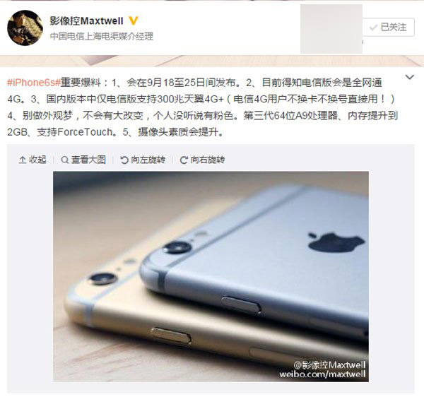 今天下午,认证为中国电信上海电渠媒介经理的微博网友@影像控Maxtwell突然发文爆料国行电信版iPhone6s的消息。在他的口中,iPhone6s的发布日期将会在9月18日-25日之间。此外他还表示粉色版尚不确定是否存在。