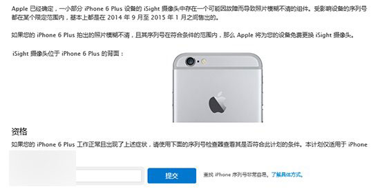 之前,脚本之家家已经报道过,部分苹果iPhone6 Plus的iSight摄像头出现了故障,导致手机无法对焦。当时,苹果承诺为出现问题的用户免费更换摄像头组件。今天,苹果中国也正式上线了iSight摄像头的更换网页,用户只需要提交手机序列号,就可以简单查看是否符合更换条件。