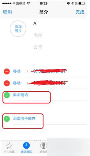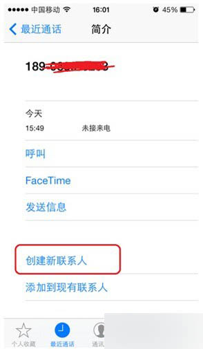 进入"i"选项后,点击红圈所示”创建新联系人”,你可以把名字设置为“A”,这样方便你快捷操作。