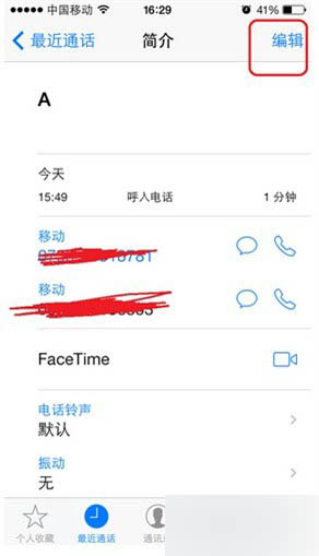 以上的步骤只是说明了对单个电话的阻止,下面我再给大家说一下如何对多个电话或短信的阻止,进入电话选项找到通讯录中你设置的阻止号码的名字,比如我的是A,点击图片右上角红圈所示编辑选项进入。