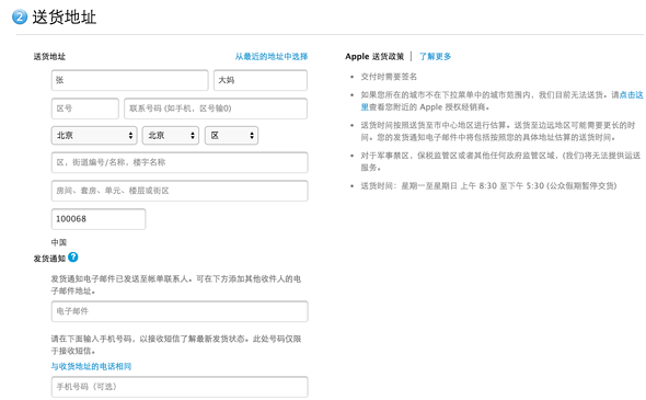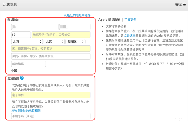 在Apple ID注册完毕后,就可以正式登录苹果中国官方商店了,不过为了能够快速的付款下单,也是建议事前填好详细的收货地址(对于新iPhone的预订抢购来说尤其重要)。