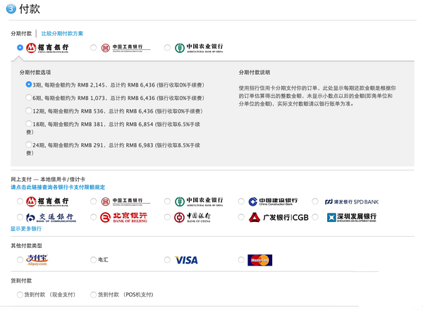 (2)在付款页面我们能够看到苹果官方在线商店支持包括货到付款(现金/刷卡)、分期支付(招商/工行/农行,最长12期免息,免息入口在此)、信用卡/借记卡(19家国内银行)、支付宝、境外信用卡(VISA/MasterCard通道)等多种付款方式。