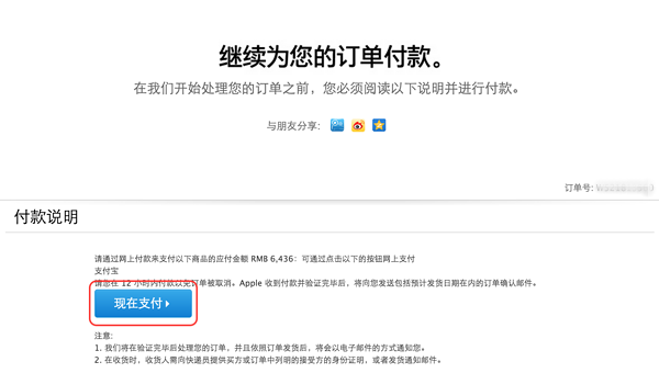 (5)在下单完成之后,如果选择的是信用卡在线支付、支付宝等非货到付款方式,那么您还需要进入最后付款环节,值友们也可选择货到付款方式购买来节约下单时间。在最终付款完成之后您就将成功预定您的新iPhone,同时注册Apple ID的邮箱也将会收到来自苹果中国线上商店的确认邮件。