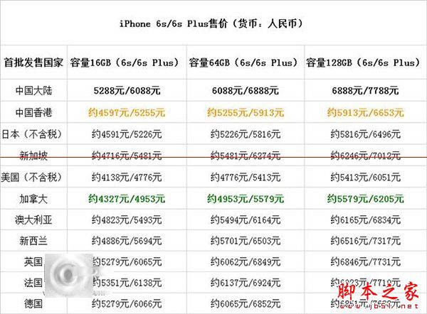 中国、澳大利亚、加拿大、法国、中国香港、德国、日本、新西兰、新加坡、英国、美国、波多黎各,首批发售的国家里面包括中国,最低价为美版iPhone,约合4100元左右起,香港售价为4597元起,国行价格依然为5288元起,将于12号预定,25号上市,同时iOS 9将于9月16日正式推送更新。