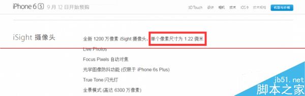 其中,摄像头一栏“1.22微米像素尺寸”的字样无疑给激动的粉丝猛浇一盆冷水。与之前苹果引以自豪的1.5微米像素直径相比,1.22微米的数字是明显的退步。