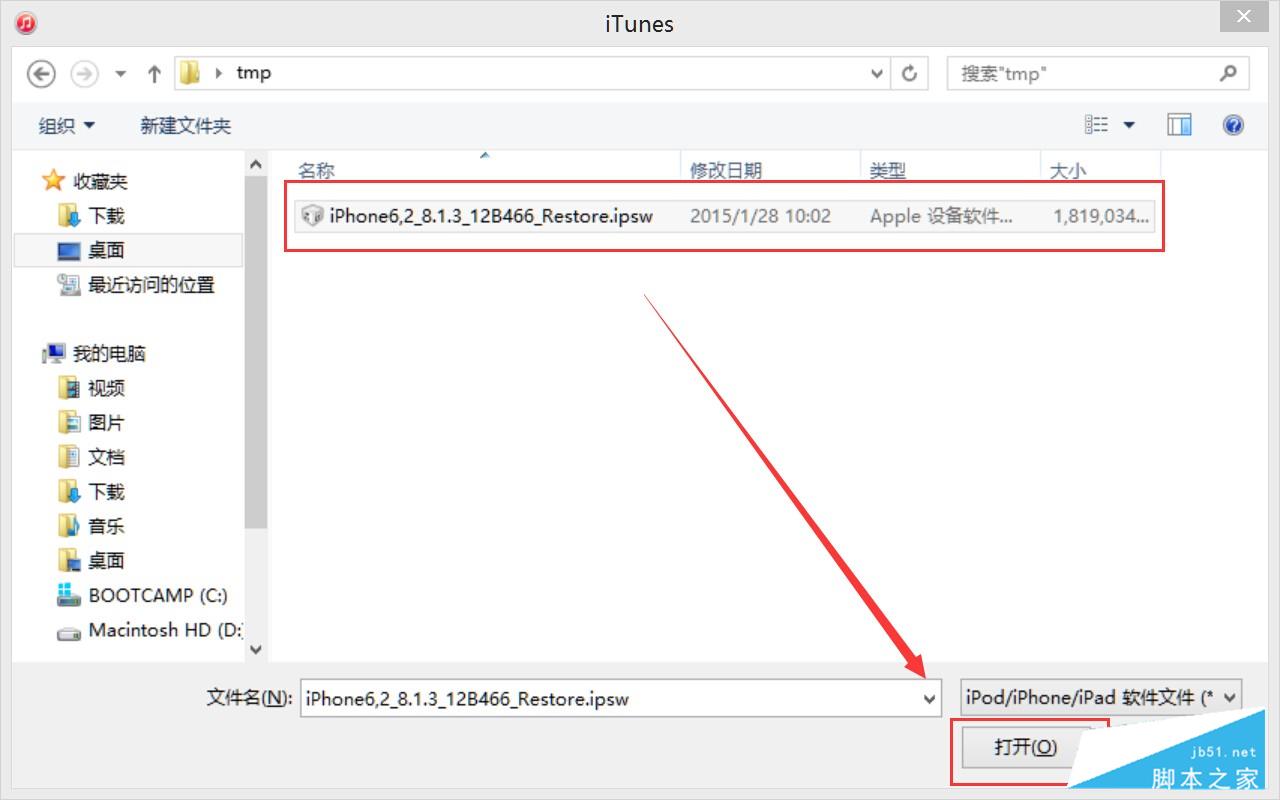 4.iTunes会弹出对话窗--请选择已经下载好的固件(这里截图是iOS8固件,只要选择iOS9固件即可);然后点击更新--等待iTunes运行。