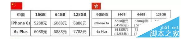 16GB/64GB/128G港版iPhone 6s分别售价约4597元/5255元/5913元;