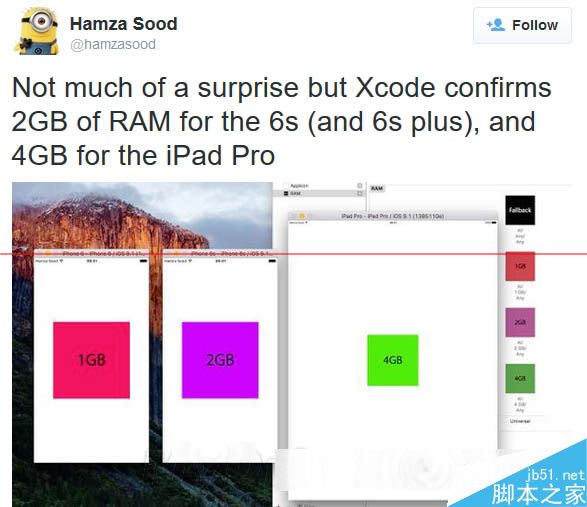 之前Adobe曾不小心的透露,iPad Pro内置的4GB内存,而现在Xcode中同样给出了答案,的确是4GB内存。其实iPhone 6S尚未发布前,就有很多消息强调,新一代iPhone会内置2GB DDR4内存,这样也会更加省电,并且从6S开始,新推出的iOS终端,其RAM都会是2GB起步。