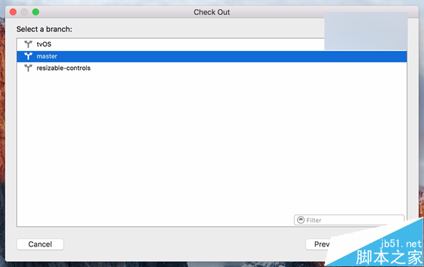 7、选择一个分支,例如我们选择“Master”,然后再次点击“Next”下一步,这时候Xcode就会自动下载编译所需的源代码,耐心等待一段时间,完成后,Xcode会自动在新的项目窗口中加载该代码。