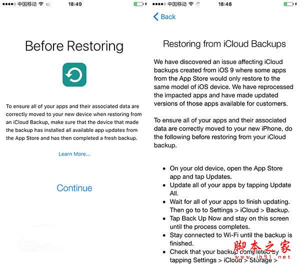 临时解决方法:苹果要求用户在使用通过iCloud云备份进行还原前,首选使用旧设备打开App Store,检查并更新所有已安装软件,完成之后进入“设置——iCloud——备份”,选择“立即备份”,等待iCloud云备份完成,之后重新回到iPhone6s、iPhone6s Plue等新设备上,执行从iCloud还原备份即可。