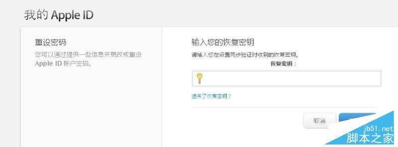 注意,完成这一步之后,我们将成功开启两步认证。那么,这个两步认证应该如何使用呢?开启两步认证之后,我们需要输入验证码才能对 iCloud 等内容进行操作。而如果你想要修改 Apple ID 的密码,则需要输入上面获得的恢复密钥,如下图所示。