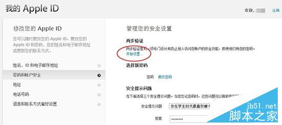3. 点击左侧的“密码和账户安全”选项,并回答此前设置的安全提示问题,开始两步验证的设置。