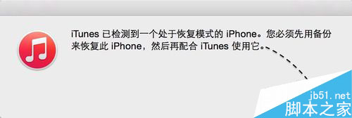 第四步、当看到屏幕黑屏时,请松开电源键,继续按住主屏 Home 键,直到电脑端的 iTunes 出现下图中的界面。