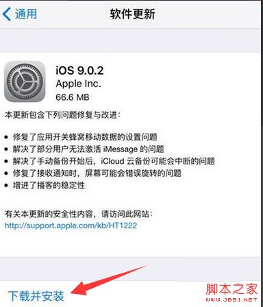 这时系统将自动进入软件更新的搜索,搜索完毕之后,将可以看到本次iOS 9.0.2的更新包大小,其实也并不是太大,60几M的容量大小,我们直接点击下载安装按钮