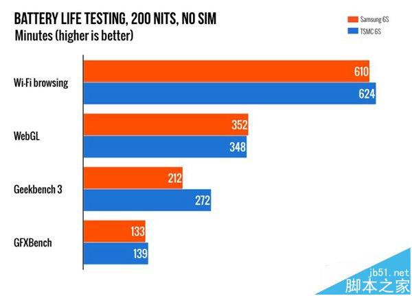 原来,之前看到的网友测试基本上是由Geekbench 3完成的,它在测试时会迫使手机以最高CPU使用率运行,直到电池耗尽。但是三星版A9芯片只有在执行CPU密集型任务时才会出现明显的能耗波动。也就是说,两款CPU在日常使用过程中并不会出现太大的能耗差异。