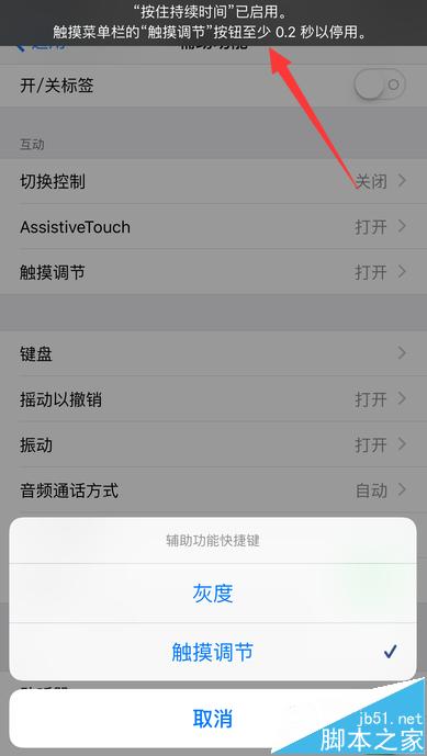 5、进入触摸调节设置页面当中,将【触摸调节】右侧的开关进行打开,然后重点来了,下方的【按住持续时间】目前也是处于关闭,必须打开