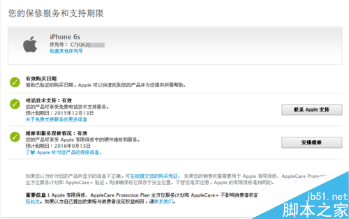 4.查询之后,页面上面就会显示出iphone6s的保修服务和支持期限,在这里还能看到是iphone6s手机,在硬件到期时间里面把保修到期时间减掉1年时间就是iphone6s的激活时间了。还有由于时差原因,可能会跟购买激活的日期不一致,相差几天内都是比较合理的。但是如果相差天数太长了,那么就有可能是手机提前被激活了,或者别人使用过了。