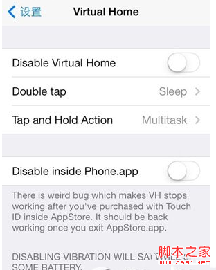 Vibrate on Touch是当我们的手指触摸到 Home 键是会振动,貌似安卓手机一样。关闭振动的话,可以减少一些电量的消耗。