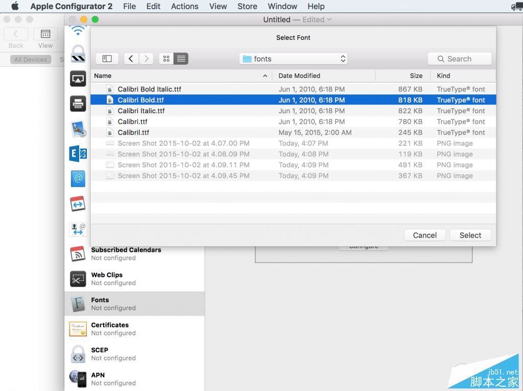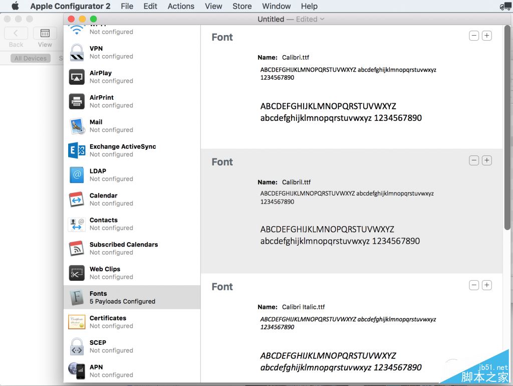 第二步:打开"apple configurator 2",新建一个profile,如图。然后在“general”,“name”里面取一个名字。这个名字会出来在ios的profile列表里面。比如以字体名称为名,“Calibri Fonts”。