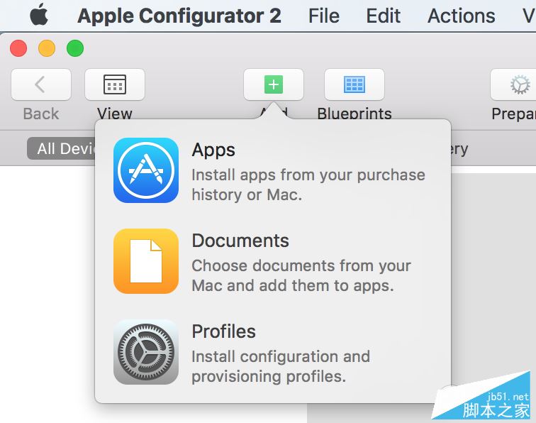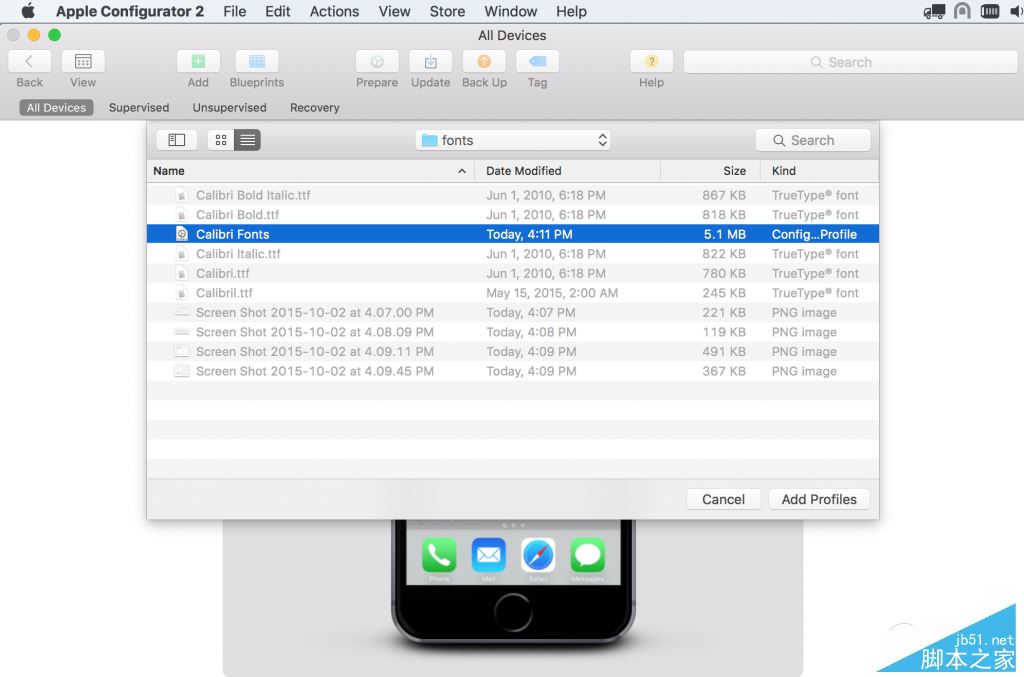 第四步:关闭刚才的窗口回到"apple configurator 2"主界面“All device”。把设备iphone/ipad连上数据线,并保持在不要锁屏的状态。在工具栏上选“add profiles”。