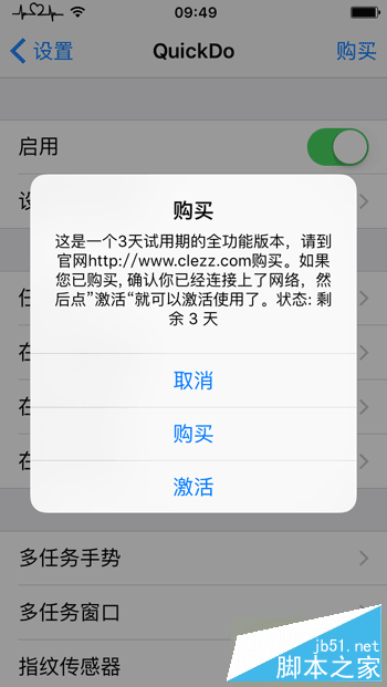 目前QuickDo可用的功能包括:顶部滑动-锁屏、长按屏幕空白处-结束后台运行任务、长按底部中间-截图等等,有兴趣的果粉可以前往Cydia安装尝试。由于QuickDo是一款收费插件,此前未购买过该插件的用户拥有3天的试用期限,到期之后需要购买才能继续使用。