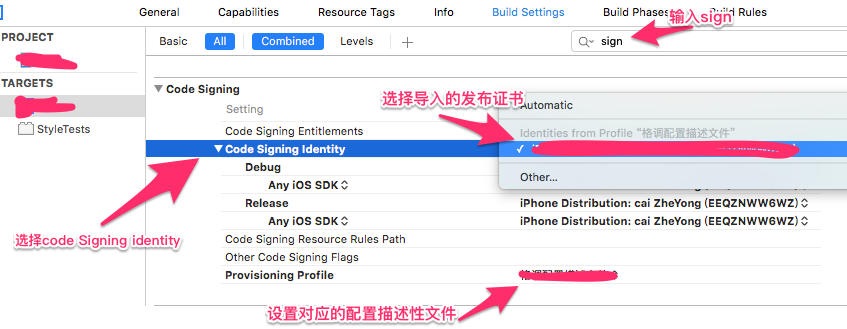 3、在build setting中设置:(注意与系统自带的iPone Distribution/IPone Development 区分开)