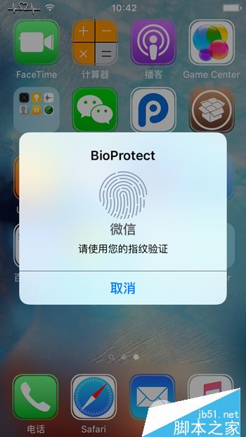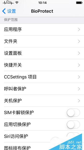 3、BioProtect保护范围:BioProtect支持为应用程序、文件夹、设置面板中的功能以及开关机、SIM卡解锁、应用程序切换、Siri以及图标排布保护等。具体设置方法(以为应用加密为例):打开BioProtect,点开【应用程序】,勾选所要加密的应用程序,返回桌面之后,打开相应的应用则需要验证指纹。