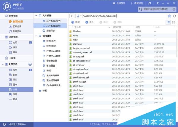 3、设备连接PP助手,在文件系统(越狱)中找到路径【/System/Library/Audio/UISounds】,建议先备份iPhone充电提示音源文件【connect power.caf】