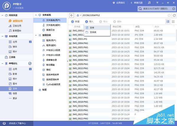 2、设备连接PP助手电脑版,在文件系统(用户)中找到【DCIM】文件夹,打开之后找到这个文件夹中数值最大的文件夹(一般情况下都是“100APPLE”这个文件夹,不过也不排除有些用户有101/102等之类数值开头的文件夹,总之选择数值最大的那个就是)