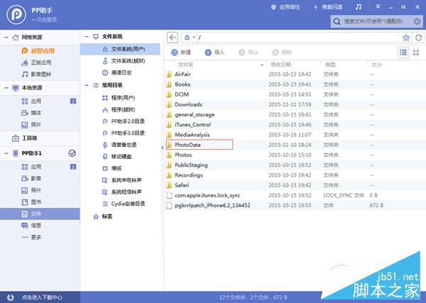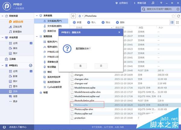 4、返回上一层,找到【PhotoData】文件夹并打开,删除里面的【Photos.sqlite】文件,然后重启设备。