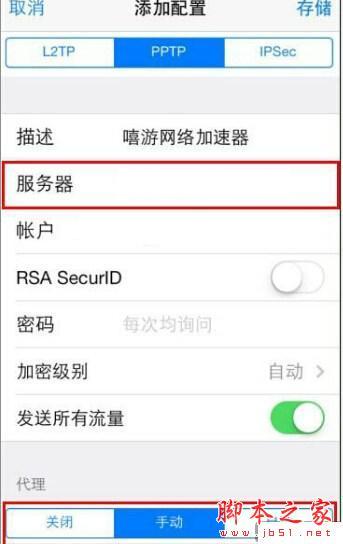 3、在添加VPN中选择PPTP,点击进入,在“描述”栏中填入嘻游。在服务器栏中填入能够使用得服务器地址:联系QQ79490724获得该服务器,在账户和密码栏中填入嘻游用户名和密码。其他设置保持不变,然后点击储存,注意加密级别要选择自动,不加密连接不上服务器。